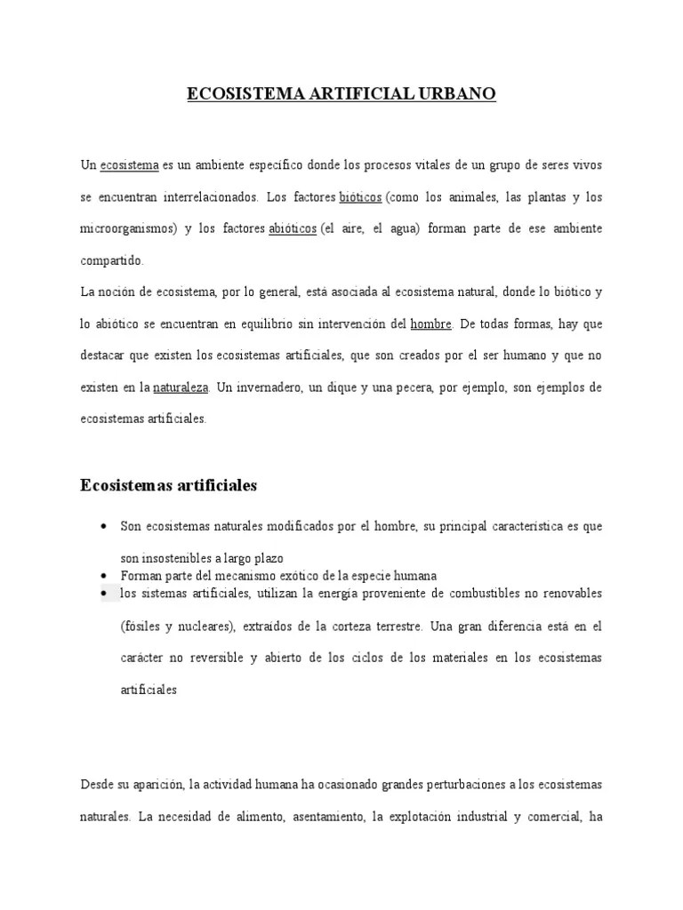 El ecosistema urbano es la ciudad, un hábitat artificial construido por el ser humano para sí mismo, donde se relacionan factores abióticos y seres vivos. Los ecosistemas artificiales tienen algunas características definitorias y forman para del tercer tipo de ecosistemas en el mundo. Los ecosistemas naturales se forman sin la intervencin del hombre. La naturaleza cuenta de elementos, tantos bióticos como abióticos. La aceptación más amplia del concepto de ecosistema artificial incluye a los asentamientos urbanos como las ciudades, pese a que éstos presentan varias diferencias con los ecosistemas naturales. 5 características de los ecosistemas artificiales (ejemplos) algunas de las principales características importantes del ecosistema artificial son las siguientes: El fin de estos ecosistemas es recrear o reproducir lo natural en un contexto no natural, es decir, artificial. El ecosistema artificial es aquél en el que la acción del ser humano ha creado espacios radicalmente distintos a los que existían hasta hace unos pocos milenios. Produce oxigeno y consume co2. Si te interesa la ecología, te recomendamos leer el siguiente artículo sobre niveles de organización de la ecología. 1 durante la última década, se ha generado una gran cantidad de información sobre los impactos del cambio climático en los ecosistemas de montaña de américa latina, áfrica y asia. Que son aquellos creados por el hombre, y que para él cumple un rol. Una pecera, es un ecosistema natural, el desierto polar, es un ecosistema artificial, un dique es un ecosistema natural, la producción agrícola es un.